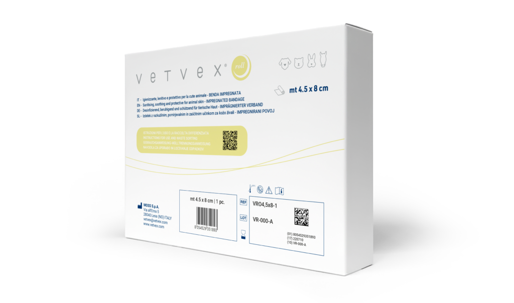 VetVeX® Roll, eine natürliche Lösung ohne Antibiotika für den Gebrauch an Tieren, ist eine elastische mit einer Öl-Matrix imprägnierte Mullbinde, die einen längeren Kontakt mit dem zu schützenden Bereich gewährleistet.